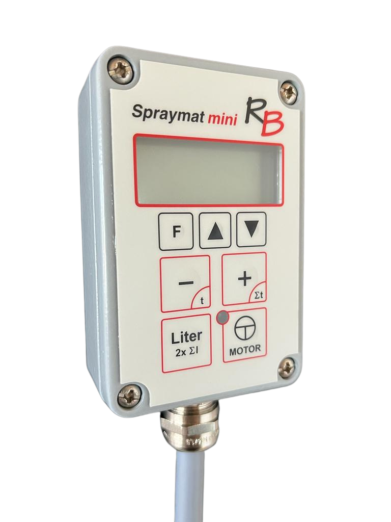 Der Spraymat Mini (12-V-Steuerpult) ermöglich Ihnen, teure Hilfsmittel möglichst exakt auszubringen. Er ist die optimale Steuerung zu unseren RB Sprayern. Die Anzeigeeinheit informiert im Betrieb über die Ausbringmenge in Liter/Minute sowie die Menge in Liter pro Auftrag und den Tagestotalverbrauch in Liter. Im Anzeigegerät sind die Funktionen: Pumpe Ein/Aus und die stufenlose Pumpendrehzahlregulierung enthalten. Durchflussmesser und Kabelsatz sind im Kit inbegriffen. Das Anzeigegerät ist mit einem Magnethalter ausgestattet.